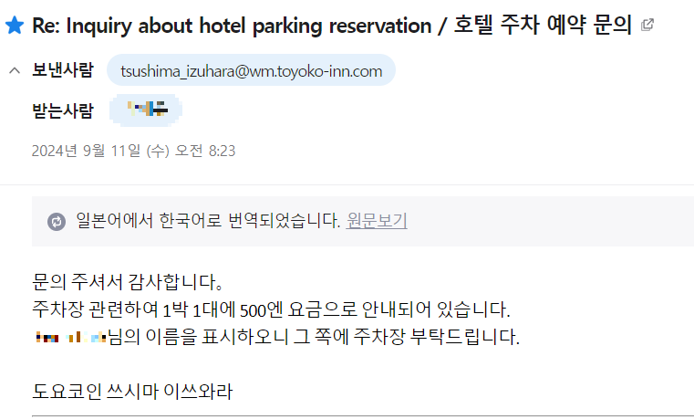 토요코인호텔에 자동으로 예약이 되는줄 알았는데 주차공간은