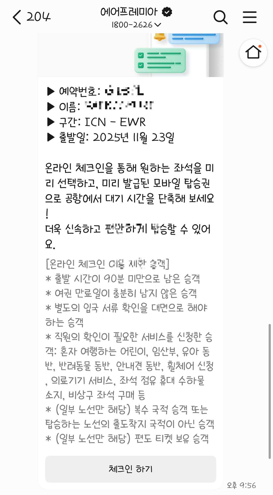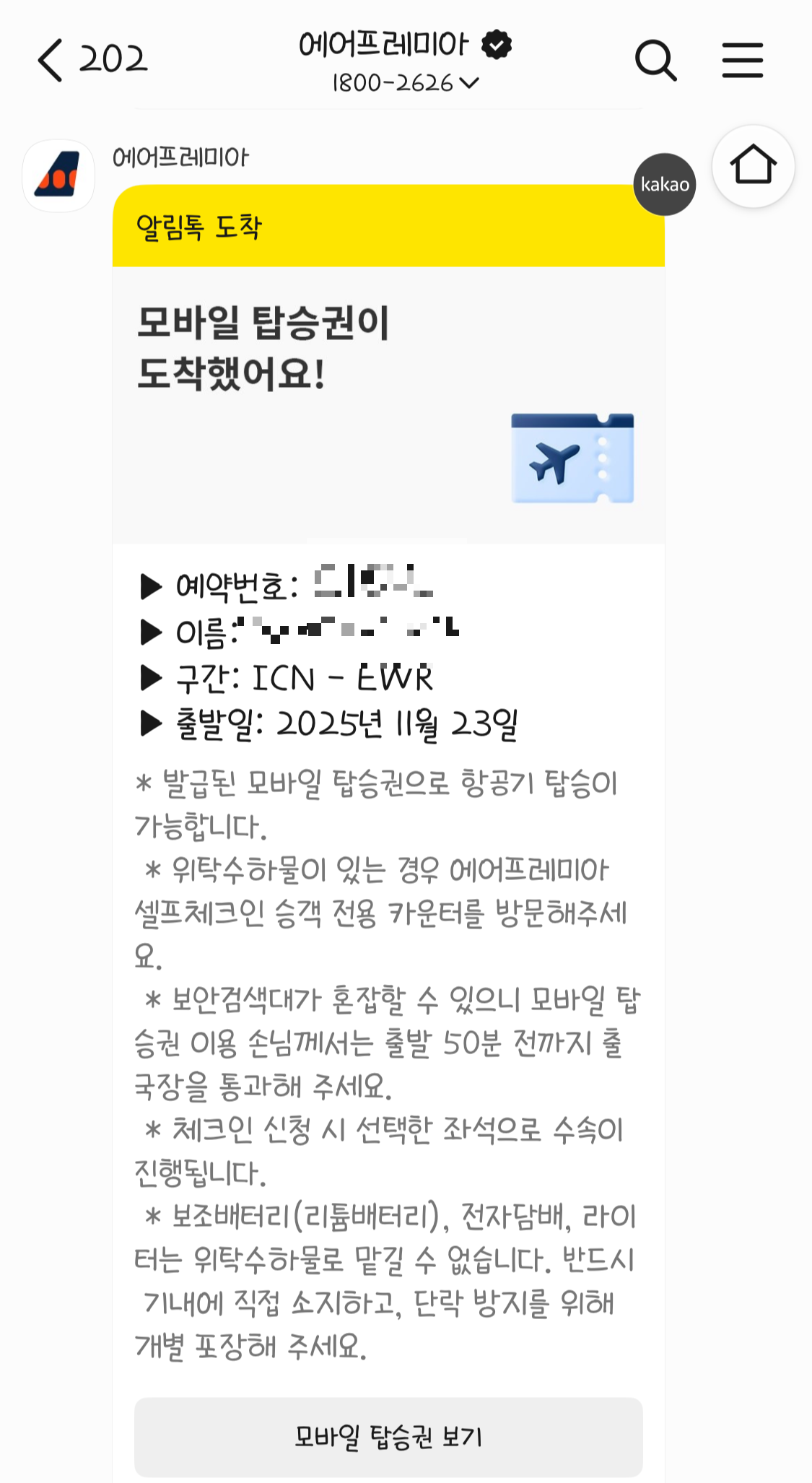 에어프레미아를 예매하고 출국 48시간 전에 카톡으로